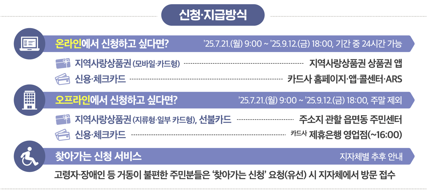 오프라인 신청: 2025년 7월 21일 9시부터 2025년 9월 12일 18시까지 주말을 제외하고 신청 가능합니다. 지역사랑상품권(지류형 일부 카드형)은 주소지 관할 읍면동 주민센터에서, 선불카드는 카드사 제휴은행 영업점(~16시)에서 신청할 수 있습니다.